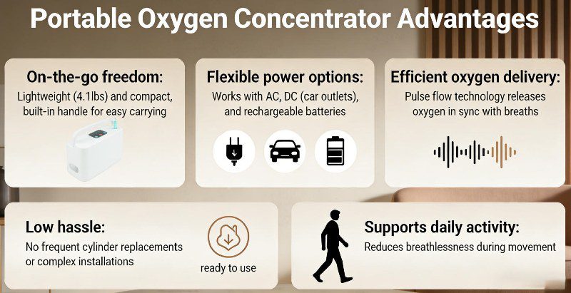 Portable oxygen concentrators weigh 3–10 lbs (1–5kg) (varies by battery). Heavier models roll on a cart; lightweight ones—like Inogen—are hands-free to wear.